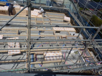 【写真 下中】 断熱材の上に24mmコンパネを敷き詰めます。