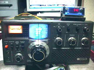 【写真 下中】 ラジオ用周波数カウンタを接いで地元NHK540kHz受信中。アンテナ線を周波数変換段バリコンに直結
