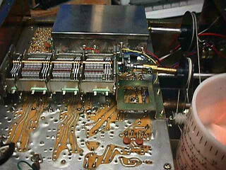 【写真 下右】 右側は第2スーパーのシールドケースの左上角がターゲットのFET部。バリコンの羽根は作業中は閉じている。
