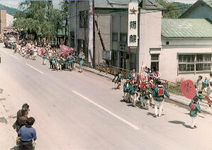 【写真 下左】 1970年ころ 拓銀前を行く山神祭の子供みこし。学校前の歩道橋からの撮影です。