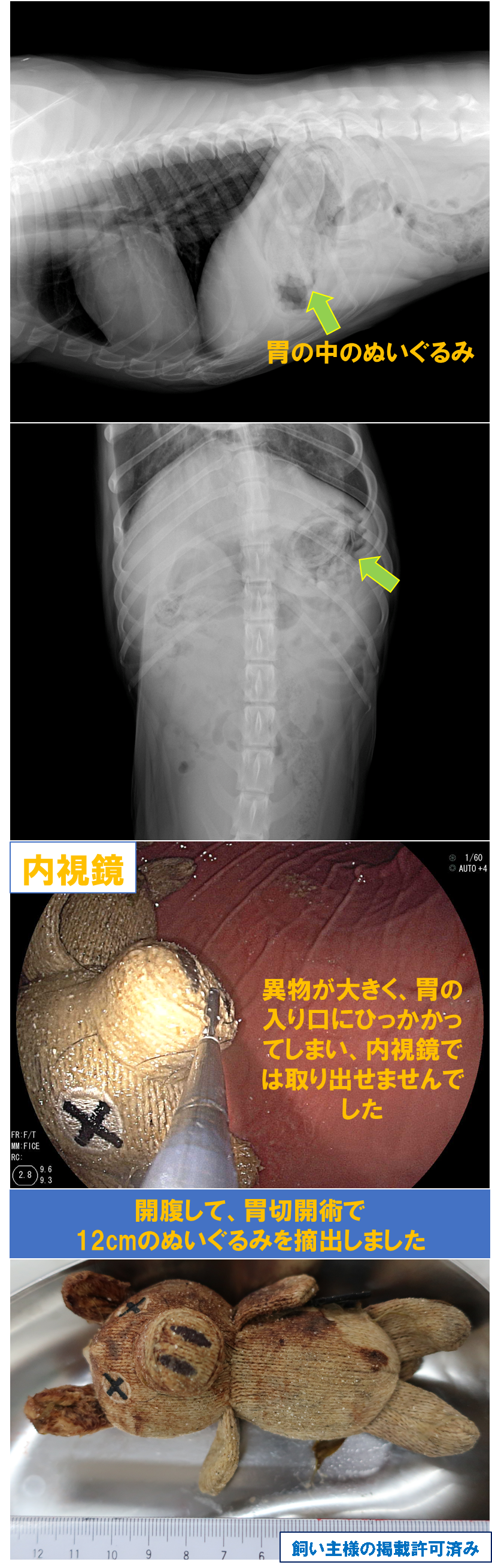 【症例2】「犬の胃内異物」 2歳 ラブラドールレトリーバー オス 2日前にぬいぐるみを誤食した。嘔気はあるが何もでてこない。 病院で催吐処置を実施し、2回嘔吐しましたが異物はでてきませんでした。 ※ぬいぐるみを破壊したり誤食する癖のあるわんちゃんにはぬいぐるみは与えないほうがいいです。