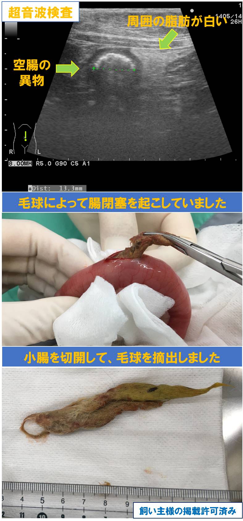 【症例4】「猫の毛球による腸閉塞」 13歳 猫 雑種 オス 前日から8回くらい嘔吐。食欲なし。 超音波検査を実施し、異物による腸閉塞を疑いました。 開腹して、腸切開術で小腸内の毛球を摘出しました。 長毛でかなり毛が柔らかいネコちゃんだったので、毛球によって腸閉塞になっていました。 手術後は元気食欲回復しています。