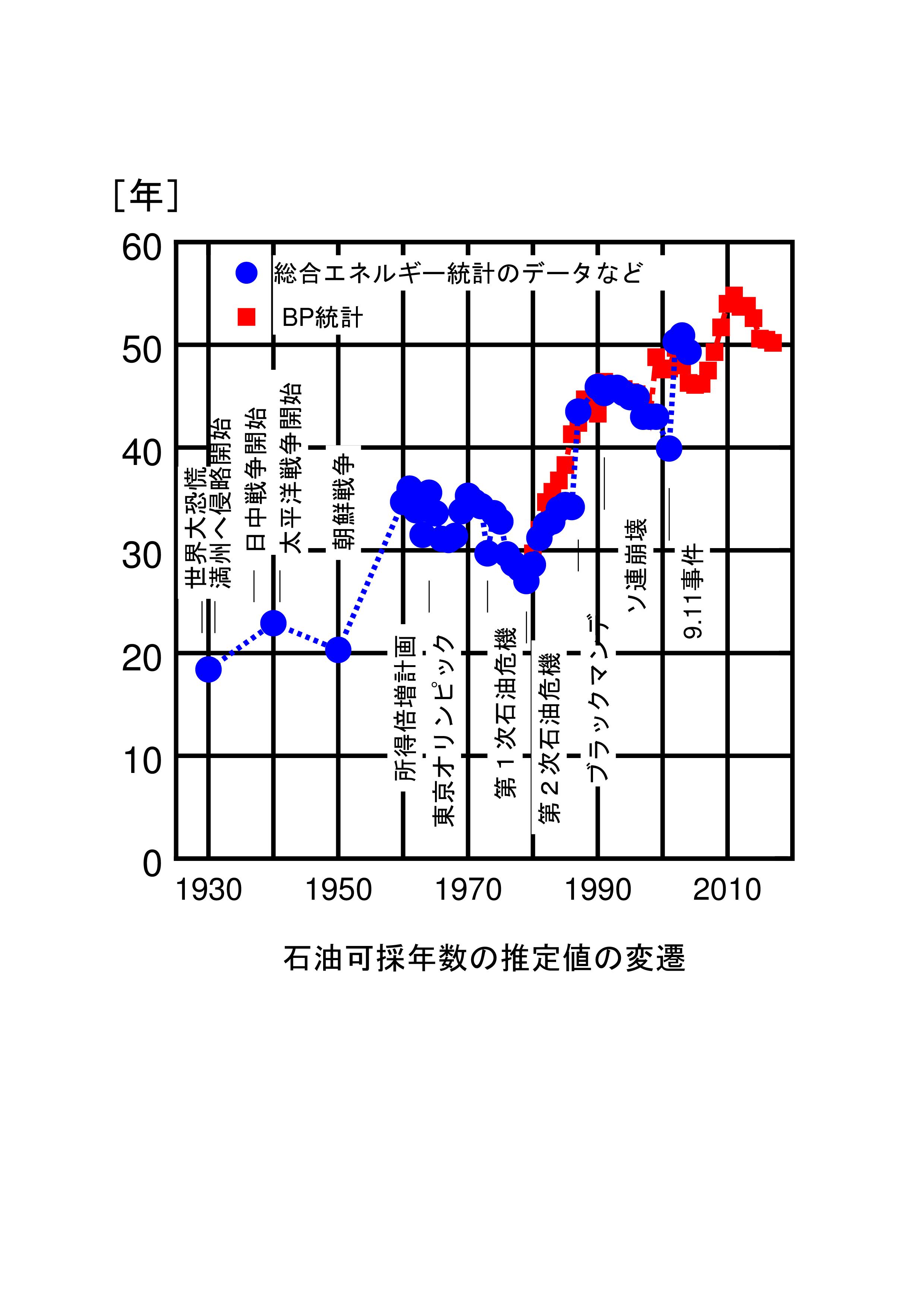 | 地球という惑星は一つの物体である以上有限です。地下に眠っていたエネルギー資源も有限です。石油をはじめとする化石燃料も、厖大に使っていけばいずれなくなってしまうことは当然です。では石油は本当のところ、いつになったらなくなるのでしょうか?石油があと何年でなくなってしまうかを評価した値を「石油の可採年数推定値」と呼びます。これは、評価する時点での確認埋蔵量(技術的・経済的に採掘ができる量)をその年における年間消費量で割った値です。その値が歴史的にどのように変わってきたかを図に示します。たとえば、1930年における石油可採年数推定値は18年でした。石油権益を確保しておくことが列強諸国の条件である時代に、この値は著しく短いものでした。そして、このことは長く辛い戦争の動機となり、日本は大陸の資源を求めて中国に侵略を始めました。しかし、この時点での石油可採年数推定値が正しいものであったとすれば、10年後には石油は後8年分しか残っていないはずです。ところが10年たった後の1940年には、石油可採年数推定値は逆に23年に延びました。それでも、23年で石油がなくなってしまうという推定は列強諸国を石油権益確保に動かし、ABCD(America,