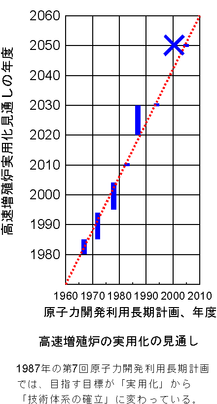 日本の原子力開発の基本方針は、原子力委員会が決める「原子力開発利用長期計画」(以下、「長計」と記載)で定められます。その「長計」で高速増殖炉が初めて取り上げられたのは、1967年の第3回「長計」でした。そこでは、高速増殖炉が「昭和50年代後半」(1980年代前半)に実用化することが目標とされています。ところが5年後の1972年の第4回「長計」では、その目標が「昭和60年代」となり、1978年の第5回「長計」では「昭和70年代」、1982年の第6回「長計」では「2010年頃」というように、どんどんと先延ばしになりました。そして、1987年の第7回「長計」では「2020年代から2030年頃」に「技術体系の確立を目指す」となって、実用化という目標すらがなくなってしまいました。さらに1994年の第8回「長計」では、その目標が「2030年頃まで」と後退した上、ついに2000年の第9回の「長計」では、目標とする年度自身を示すことができなくなってしまいました。昨年改定された長期計画は原子力政策大綱などと言う大仰な名前に変わり、再度高速増殖炉の開発の時期が書き込まれました。それでも商業用規模の1号機をようやく2050年に立ち上げようと言うものです。その経過を右の図に示します。左下から右上に引いた点線は、5年経つと目標は10年先に延びることを示しています。このように、科学的な知見が増えれば増えるだけ、目標が急激に遠ざかっていくような技術は到底実用化しません。それをあたかも希望があるかのようにいいながら、巨額の資金を投入することはおよそ常軌を逸していますし、このようなものが国の原子力開発の基本方針であったことを反省しなければいけません。