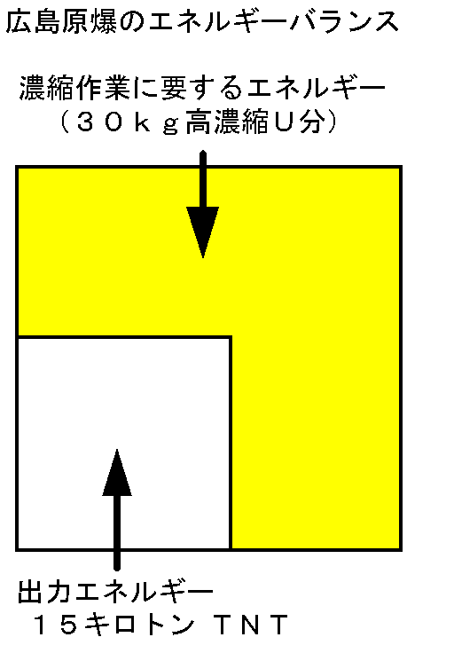 リトルボーイの爆発力はTNT火薬に換算して1万5000トン分でした。高度な軍事機密のため正確な値は分かりませんが、そのリトルボーイは約30kgの高濃縮ウランを材料に使っていたと思われます。それを得るために「濃縮」作業で使ったエネルギーは、TNT火薬5万トン分に相当します。原爆は圧倒的に強力な兵器であり、どんな犠牲を払ってでも手に入れる価値のあるものだったと思います。しかし、ウランで原爆を作ることはエネルギー的にいえば実に馬鹿げたことでした。