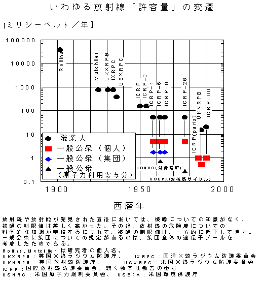 放射線が発見されたのは、20世紀を前にした1895年のことである。当初は「急性障害」の存在すら知らないまま、多数の研究者が犠牲になったが、その後次第に、「晩発的障害」もあることが分かってきた。いつの時代にも、放射線の危険度には十分に安全側の仮定が用いられていると説明されてきたが、科学的な知識が深まれば深まるほど放射線の危険性が高いことが明らかになってきた。そのため、いわゆる「許容量」も下の図に示すように大幅に厳しくされてきた。日本を含め、今日、世界各国は国際放射線防護委員会(ICRP)の勧告に従って、国内法で「許容量」を定めている。そのICRPによる危険度の評価も、この50年だけでも10倍厳しいものとされている。