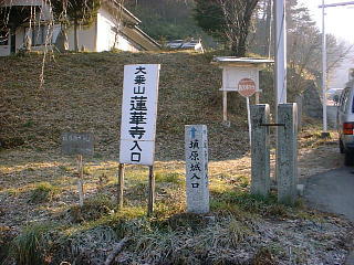 | 2000年12月15日天気(快晴) 松本市内より中山方面へ向う、東山山麓線に入る手前に蓮華寺、埴原城入り口の標識を見つける、そのまま車で進んでしまった。間もなく道幅が狭くなり車が進めなくなってしまいそうなのに気が付く、何処にも駐車出来るスペースが無い、ケッ、そうだった山城は攻め難くつくってあるんだった・・・しかたなく狭い急坂をバックで降りて入り口左にあった公民館に無断駐車してしまった。 ここからは歩きです。 入り口脇には史跡の案内看板が有りましたが、文字がもう消えかかっていました。内容は同じ看板が山中に有りました、ここをクリックで写真へ。 |