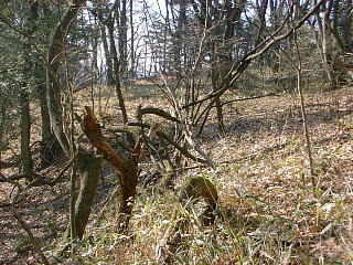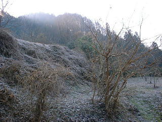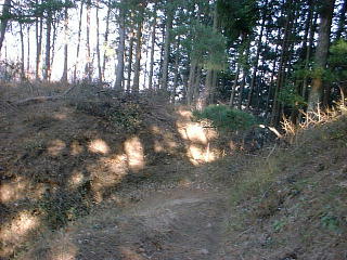| 山に入るとすぐ土塁らしき物に遭遇、平らの部分には果樹が植えられています。 | |