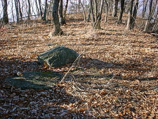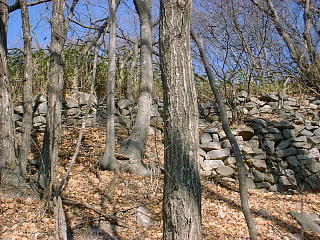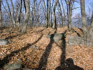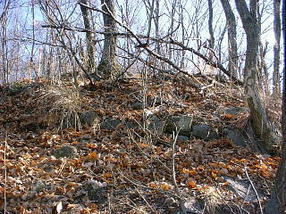 | 山頂間近で石垣の崩れた物発見、主郭、副郭の周りは石垣で固められたようである。 |