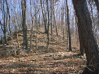| 更に前方を見上げると、尾根も狭くなり一段一段の差が確認できる、目指すは主郭。 | |