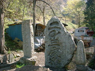 | 午前9時前回忘れたペットボトルの麦茶と、デジカメ、資料をもって一路国道19号線を明科方面へ向う、下調べした通り薄川と梓川の合流地点付近の道路沿いのスペースに車を止めた、丁度何件か飲食店がある細長い空き地が道路沿いにあり気兼ね無く駐車できました。大体の方向を決めて歩きだした。沢筋を登るはずだからと鉄道のガードのある道路で山沿いに向う。 しばらく行くと看板があった、その横には石碑が三つ立っていました。 |