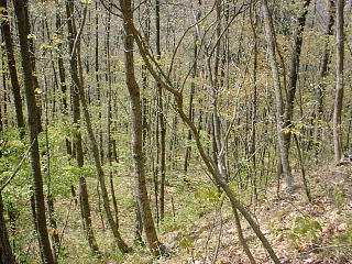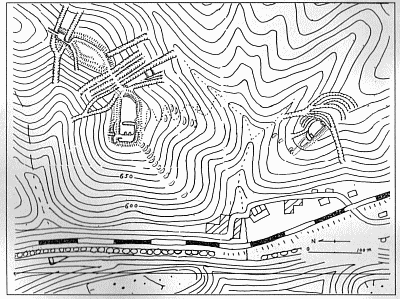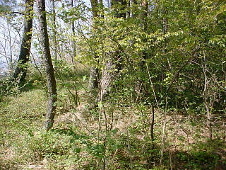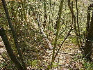 | さらに10分位登ると、竹林に囲まれた扇状の窪地に出る。本に寄れば進入する敵を左右から攻撃出来るようになっている、とある。竹が群生しているのも目隠しの為か。。。 | |