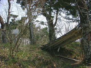 | さて主郭に突入、屋根だけが残った史跡案内、文字が消えた史跡看板が。。。 教育委員会さ〜んなんとかして下さい。 |