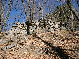 天気快晴 今朝は冷え込みが厳しく冬晴れの良い天気が予想された、思った通り素晴らしい晴天、早速カメラとメモ、それに資料コピーを準備して車に乗った。 松本市内より山辺方面へ向う、上金井を過ぎて、適当な所で左折して更に山の方へ車を進める、トータルで10分位のドライブで桐原の住居看板を電柱に見つける、うん、この山に違いないと納得して、左前方の山を目指してゆっくり車を進めた。 沢筋右前方に広めの舗装道路が有り、その裾野に看板らしき物発見、近ずくと桐原城の史跡看板であった。 車をすこし進めて路肩の広めの所に幅寄せして駐車、これでOK、早速山道を登り始めた。 |