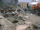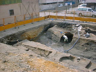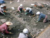 | 今回の発掘調査の結果 第一層:(1810年〜1888年)明治21年の火災層 発見された遺構(ピット19、土杭30、溝5、建物址1、埋設桶2、竹管1) 出土遺物:陶磁器(瀬戸・美濃産・備前産・京都産・など) 木製品(下駄・櫛・栓・漆椀など)金属製品 第二層:(1780年〜1810年代) 発見された遺構(ピット37、土杭47、溝5、建物址1、埋没桶4) 第三層:(1550年〜1600年頃) 発見された遺構(堀、ピット63、土杭28、溝9、建物2以上、井戸3) |