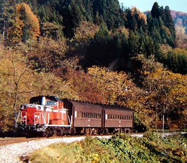 残り少ない旧型客車。川の対岸からでは遠いので、カーブの内側から撮る。(写真をアップする時に、客車の手前の道床横に立っていたポールを一部修正しました。)