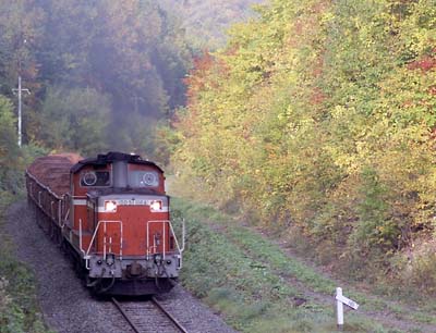 北海道1991.9.28から10.510月1日 幾寅駅から落合寄りに1Kmの北東側で返送の上り 貨物8480レ。 7:17 8480レ通過、薄曇りだがサイドから撮る。「トキ25000(8両)−DD51」 。 |