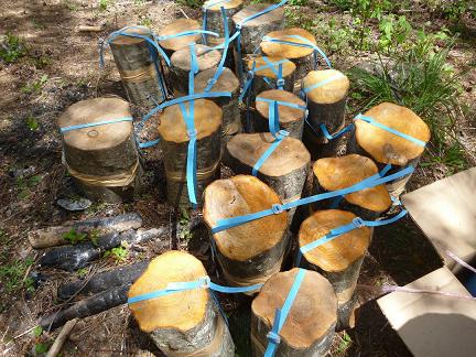 最初はきこり用のこぎりで、ほだ木に仕上げました。そのあとドリルで穴開け・駒うちといった工程で「しいたけ」をうち終え