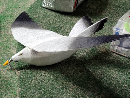 動翼はエルベータ-でコントロール。 後でフライトさせて頂きましたが、結構安定しています。 テールから延びている紐は2本をまとまると安定するそうです。 |